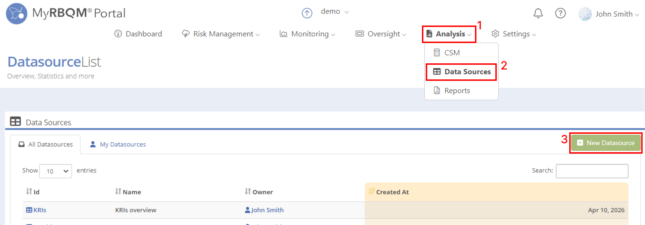 The Datasources functionality provides various data templates that can be used to export data to Excel or serve as a basis for reports. These templates currently include datasets for released RACT, risks, tickets, ticket actions (ICA and PA), and KRIs.