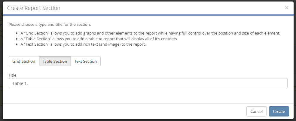 - A Table Section allows you to add a table to report that will display all of it's contents.