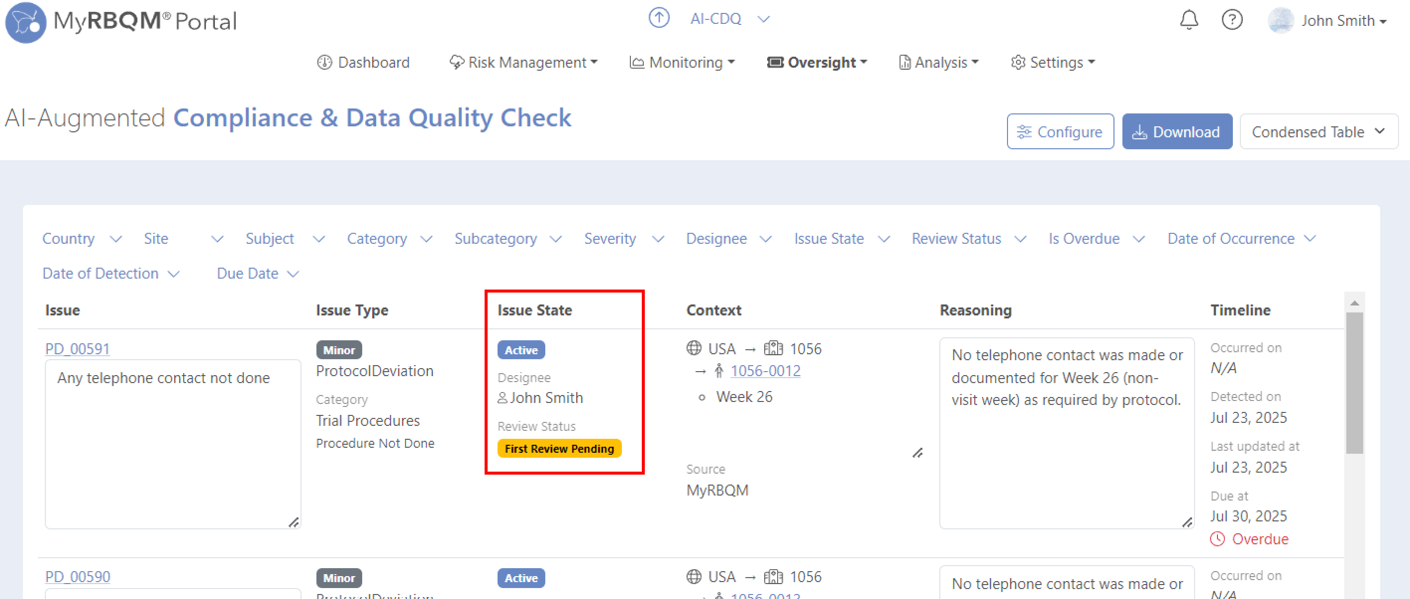 The current status of each identified issue can be viewed on the Issues List page (as shown in the image below). When a new issue is created in the system, it automatically receives the state: Active and the status: First Review Pending. The assigned default designee is notified that a new issue requires attention.