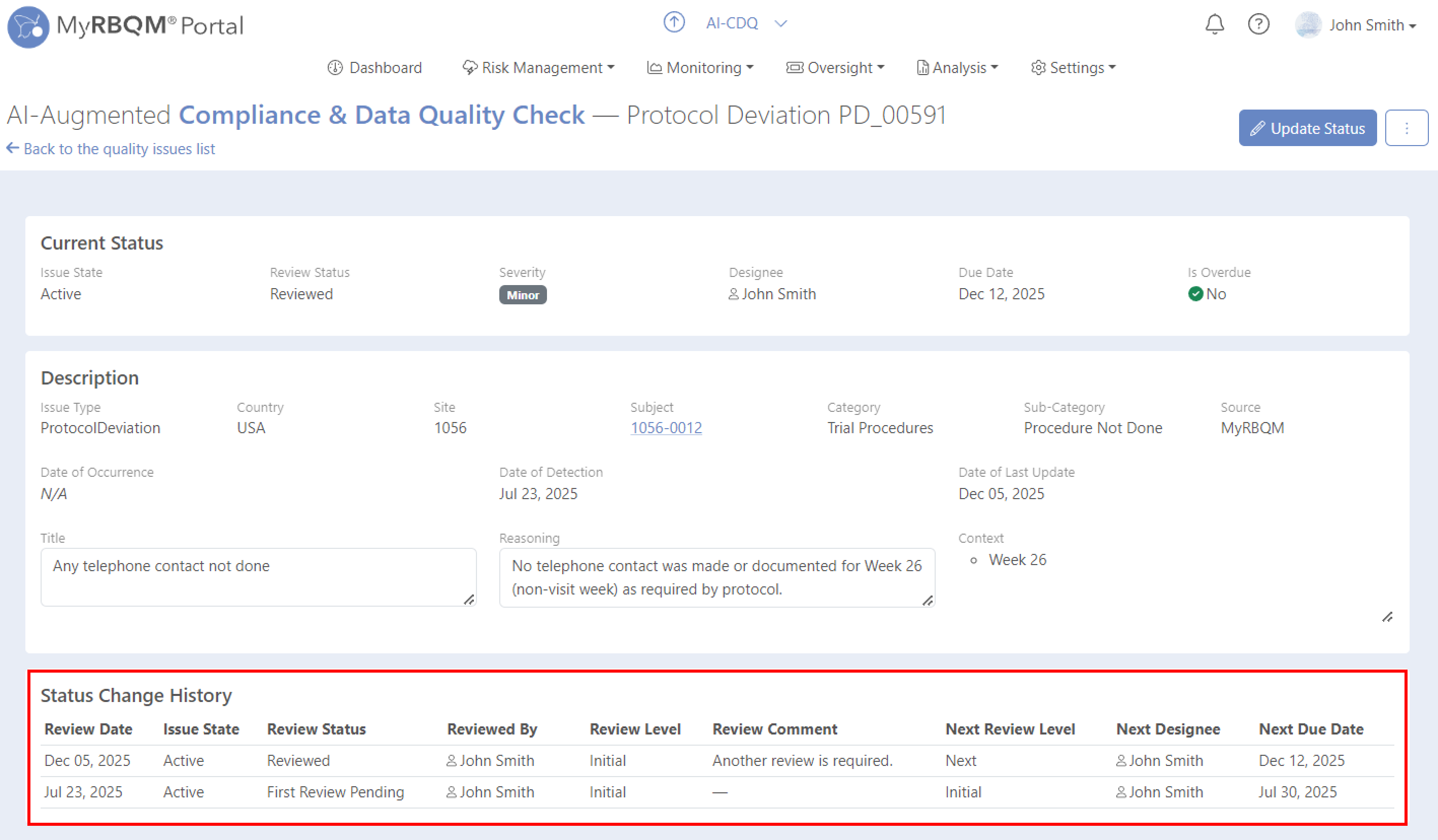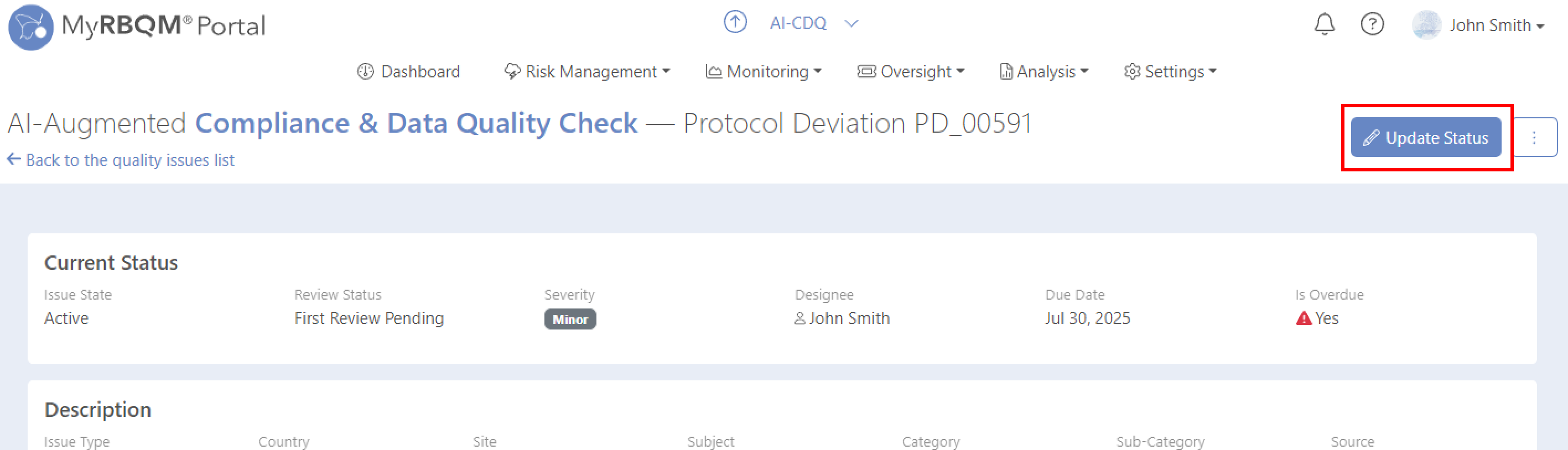 Every time you perform a Status Update, the action is recorded in the study audit trail under the action name Update Compliance & Data Quality Issue Status. This ensures full traceability of all decisions and changes made to the issue.