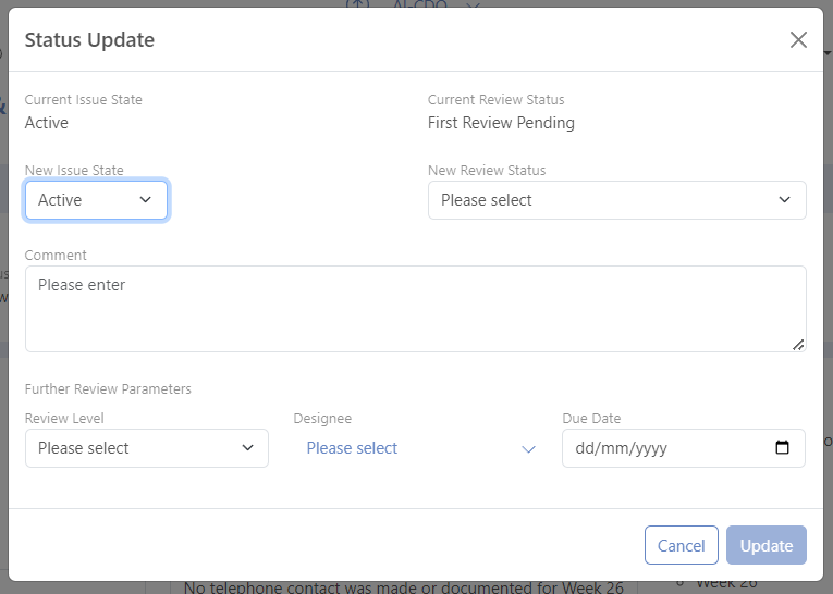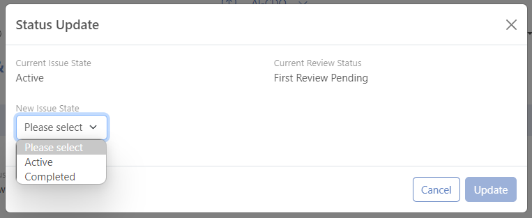 When you click Update Status on the Issue Details page, a Status Update window opens. This window displays the issue’s current state and review status, and allows you to define the next steps.